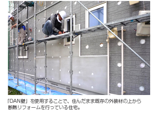 A外壁の断熱リフォームは、基本的に壁の中の断熱材を入れ換えたり、断熱材を追加したりするため、壁を剥がすことが前提となりますが、事前の調査で壁の中の断熱材が十分機能していると判断できれば、屋外側から壁を剥がすことなく断熱材を追加することも可能です。 例えば外断熱と外装材を兼ねた『DAN壁』(だんぺき・ダンネツ製造販売)を使えば、既存の外装材の上から直接施工できるため、住んだまま工事を行うことができ、廃材の発生も抑えられます。仮住まいの費用がかからず、廃棄物の処理にかかる費用も少なくなるため、工事費用を抑えることにもつながります。