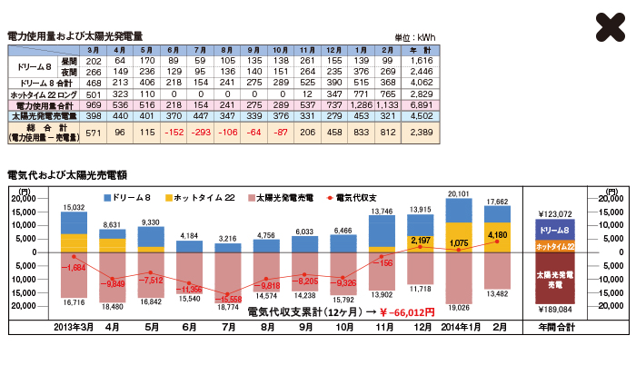 また、光熱費は年間の電気代約12万3000円に対し、太陽光発電の売電収入は約18万9000円。差し引き6万6000円の“黒字”となりました。買取価格が42円/kWhと高かったこともあり、電力使用量が売電量より多かった3〜4月も収支はプラスとなっています。電気料金のほうが多かったのは、12〜1月の3ヵ月間のみで、その差額は合計しても1万円に満たないほどでした。